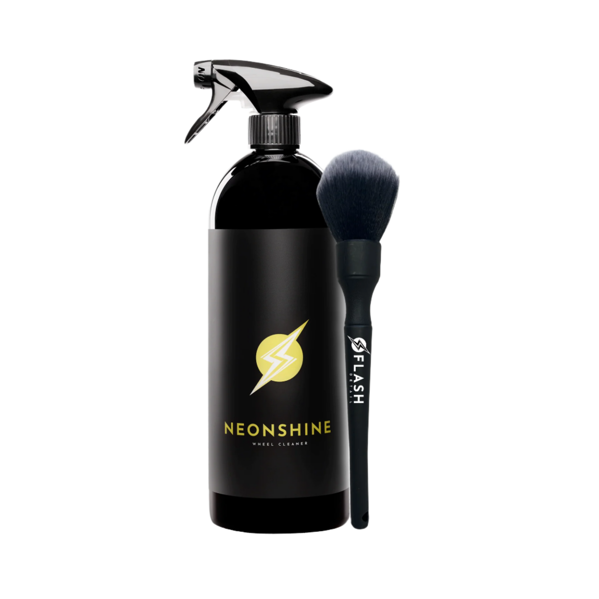 The WHEEL CLEANER PACK includes NEONSHINE, a powerful, acid-free rim cleaner, and a special Flash Detailing brush. NEONSHINE effectively removes brake dust, rust, and rubber scraps from all types of rims. Its state-of-the-art gel formula visually indicates the cleaning progress by changing color from red to purple during the short exposure time. This pH-neutral cleaner is gentle yet effective, ensuring safe use on all rim types.